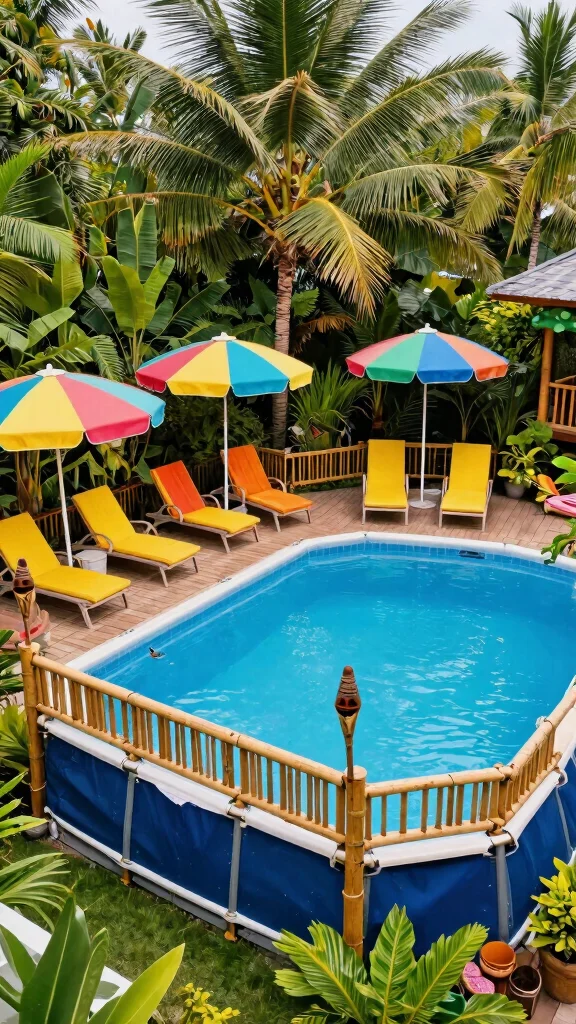Add tiki torches for mood lighting and tropical plants for authenticity. Brightly colored lounge chairs and beach umbrellas will round out your vibrant oasis.