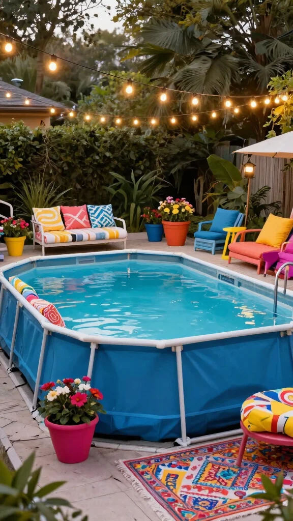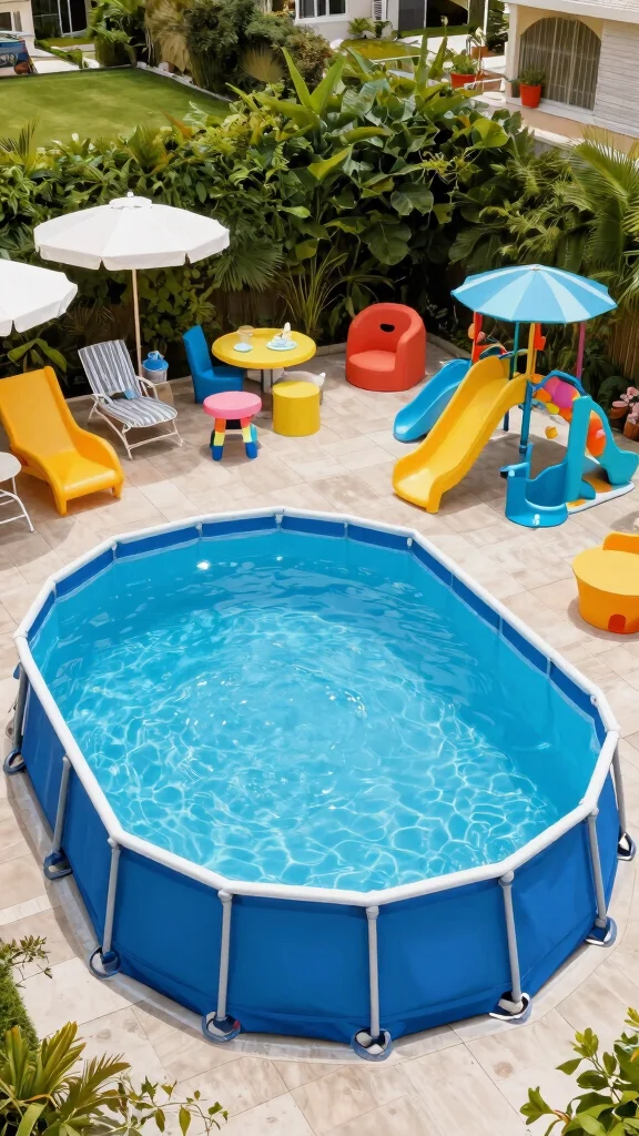 Consider adding a small play structure or water slide that connects to the pool for extra excitement. Use bright colors and fun patterns in your furniture and accessories to create an inviting atmosphere for all.
