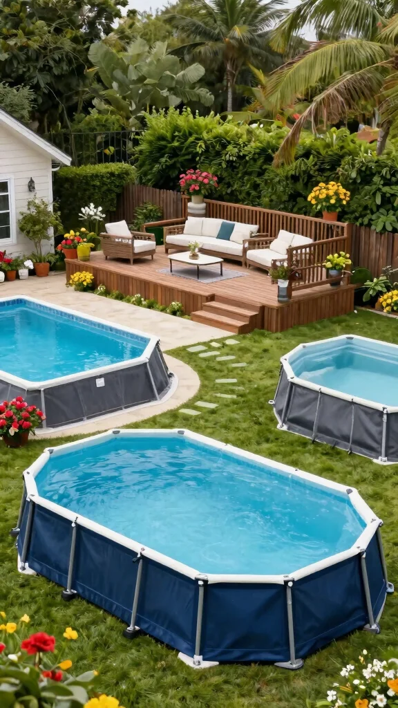 A half deck around above ground pool becomes your tropical retreat—think tiki torches, bamboo railings, and sunlit lounge chairs. You’ll transform summer days into mini-vacations, one DIY detail at a time.