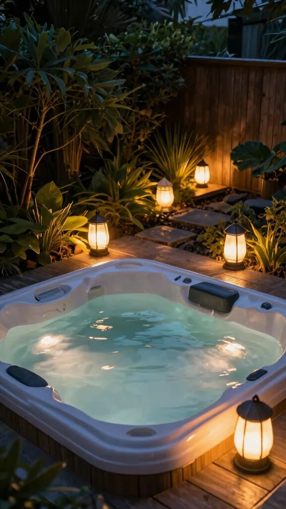 Enhancing your hot tub area with nighttime lighting can turn your garden into a magical retreat. Utilize solar lights, lanterns, or underwater LED lights to establish a soothing ambiance after dark.