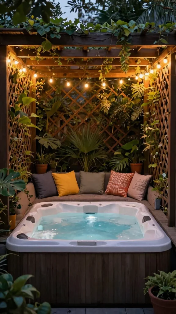 Designing a cozy nook around your hot tub can create an intimate retreat. Use trellises adorned with climbing plants to enhance privacy while incorporating soft seating with cushions and throws for comfort.