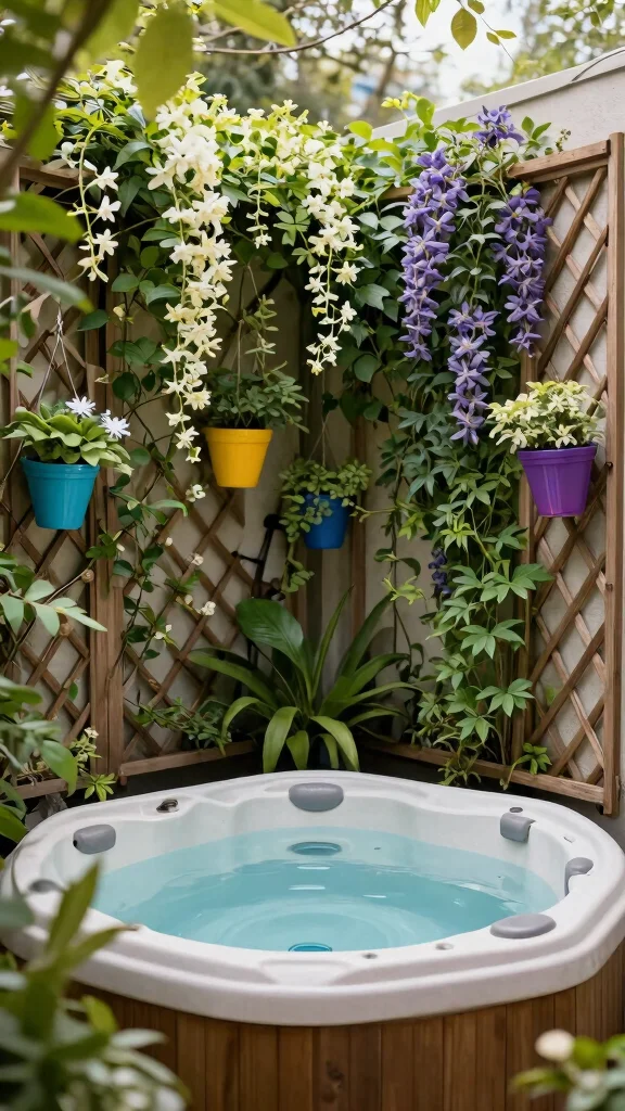 Enhance the intimacy of your hot tub area with DIY privacy screens adorned with climbing plants. Using trellises or wooden panels, you can create a natural barrier that not only provides seclusion but also adds lush greenery to your space. Vines like jasmine or clematis will flourish, offering both visual appeal and fragrant blooms that heighten the spa-like ambiance.
