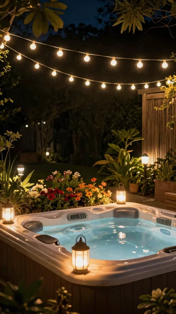 Fun fact: lighting can boost perceived value by 20-30% in outdoor spaces. With solar-powered string lights and lanterns, your hot tub patio ideas on a budget glow warmly after sunset—no complex wiring needed—and your garden blooms become moonlit scenery.