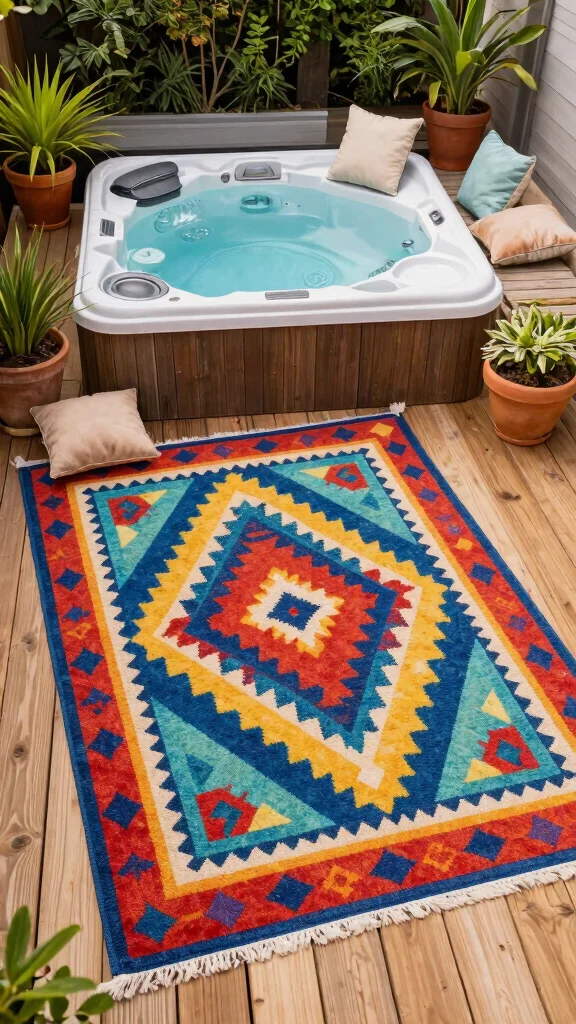 Place the rug under seating arrangements or around the hot tub to define different zones in your outdoor area. Not only do they offer comfort underfoot, but they also enrich the overall aesthetic of your space.