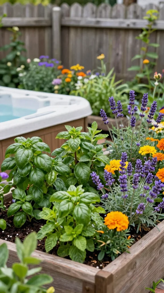 Did you know a small herb bed by your hot tub can cut grocery trips by 20%? These hot tub patio ideas on a budget pair raised beds with basil, mint, and rosemary, adding scent and flavor fast. Add lavender or jasmine for a spa-like aroma.