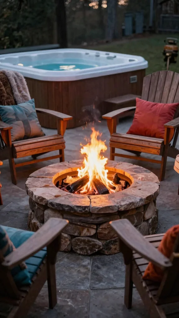 Create a cozy gathering spot near your hot tub with a budget-friendly fire pit. You can easily build one using stones or bricks from a local landscape supplier. This creates a warm area for friends and family, making your patio usable even in cooler months.