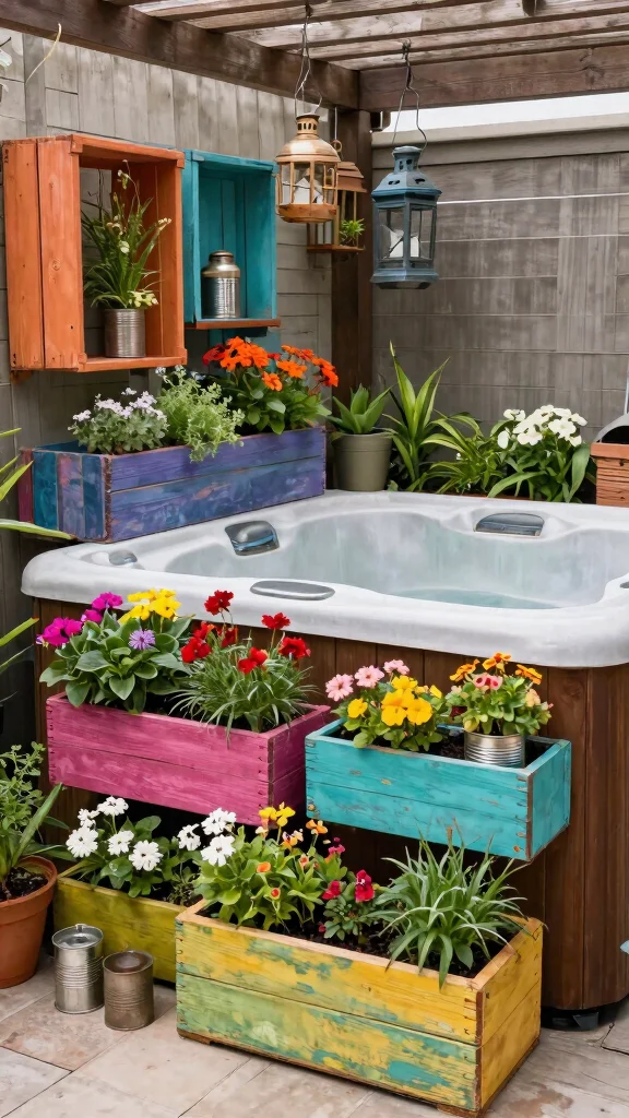 Get creative by using upcycled materials to craft unique planters and decor for your hot tub patio. Old wooden crates, tin cans, and repurposed furniture can be transformed into charming garden elements. Bright colors or a rustic finish can add character to your outdoor space.