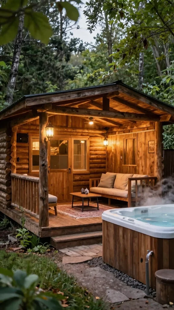 Select materials like logs or rough-hewn boards to achieve an authentic rustic look. Design a small porch area with comfortable seating for those leisurely evenings outdoors. Enhance the ambiance by incorporating lanterns and outdoor rugs to create a warm and inviting atmosphere.