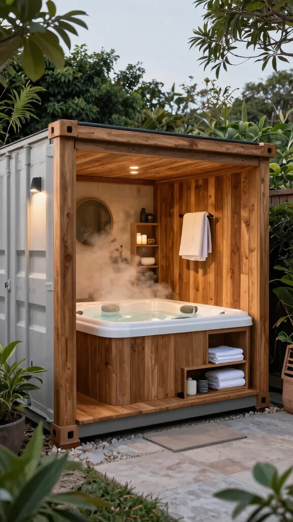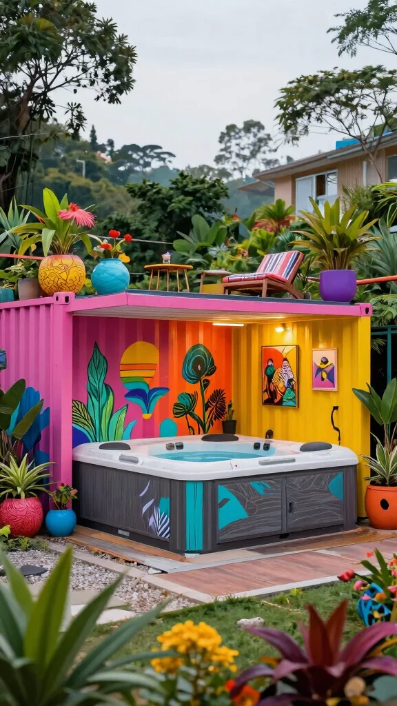 For those who love creativity, an artistic hot tub shed made from a shipping container can add a splash of color to your garden. This design stands out with vibrant paint and eclectic decor that showcases your unique personality.