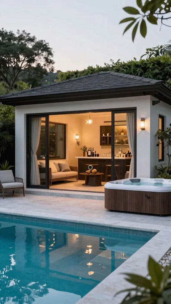 By integrating your hot tub into a chic pool house, you create a luxurious outdoor retreat perfect for enjoyment throughout the year.