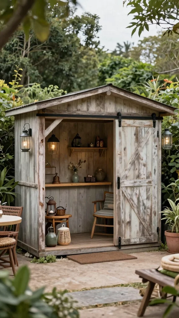 Use weathered wood to achieve that authentic farmhouse vibe. Enhance the ambiance with vintage decor items like old lanterns and reclaimed furniture. Consider designing the shed as a social hub for friends and family to gather and enjoy.
