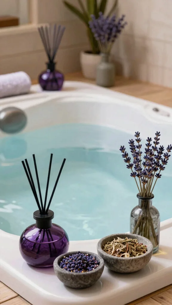 Create a designated aromatherapy corner near the hot tub, stocked with your favorite essential oils and diffusers. Natural elements like stone bowls filled with dried lavender or herbs can add an elegant touch to your space.