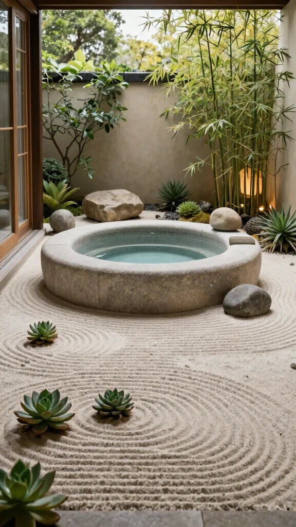 Transform your indoor space into a Zen garden oasis with a minimalist hot tub design. Opt for a sleek stone or concrete hot tub, surrounded by neatly raked sand or smooth gravel. Low-maintenance plants like succulents and bamboo can enhance the authentic Japanese feel, making this space a peaceful retreat. Adding decorative stones or a gentle fountain will further enhance the calming atmosphere.
