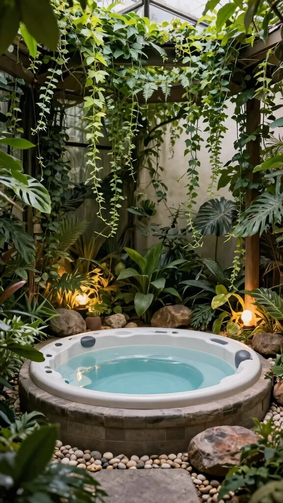 Fun fact: A trellis with philodendron or jasmine around your indoor hot tub creates a lush, spa-like backdrop that visually enlarges the space by up to 30%. Let vines drape over the tub for a natural, fragrant embrace.