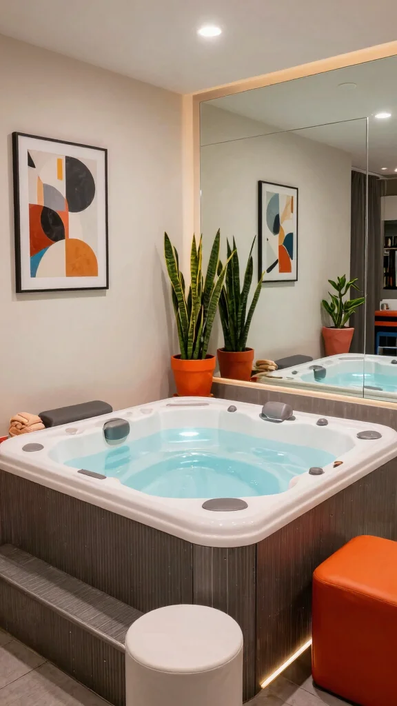 In the heart of the city, an indoor hot tub can serve as a chic escape from the urban hustle. Pair a modern hot tub with contemporary art and sleek furniture that reflects your unique style. Use bold colors in your decor to create an energizing atmosphere, complemented by low-maintenance plants like snake plants or ZZ plants.