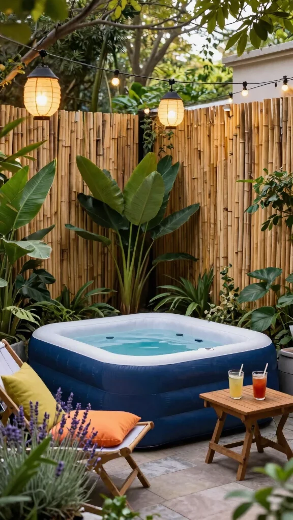 Imagine your own cozy corner retreat, where you can unwind in an inflatable hot tub nestled among tall plants. This serene spot offers privacy while allowing nature to enhance your experience. By adding bamboo screens or trellises, you can create a stylish sanctuary that feels secluded and inviting. Pair this setup with comfortable lounge chairs and a small side table to hold your favorite drinks for the ultimate relaxation zone.