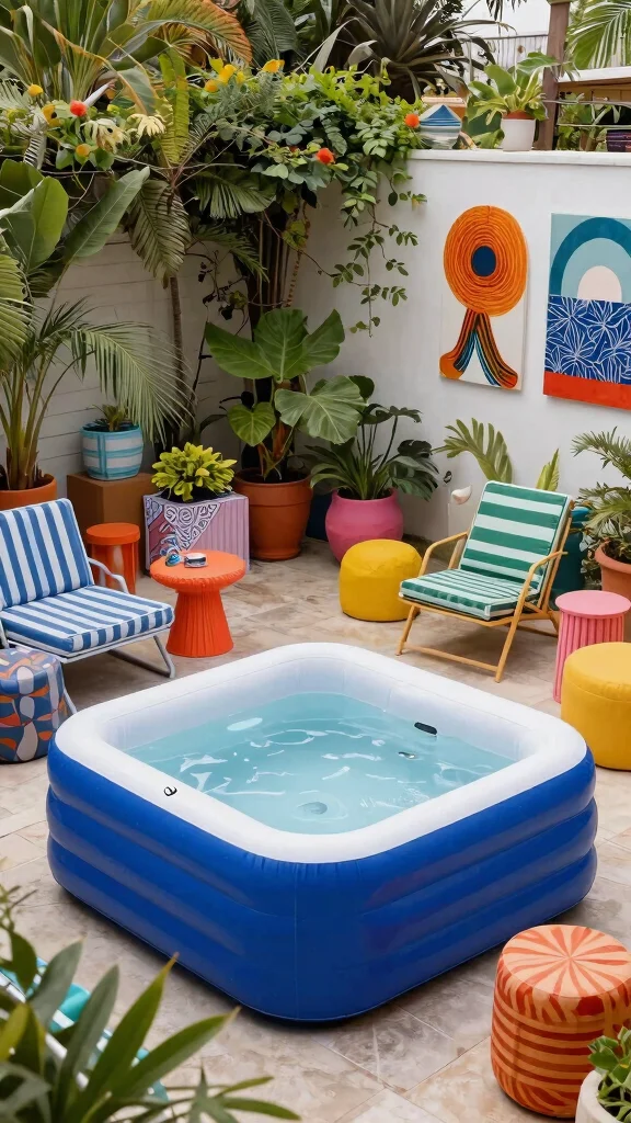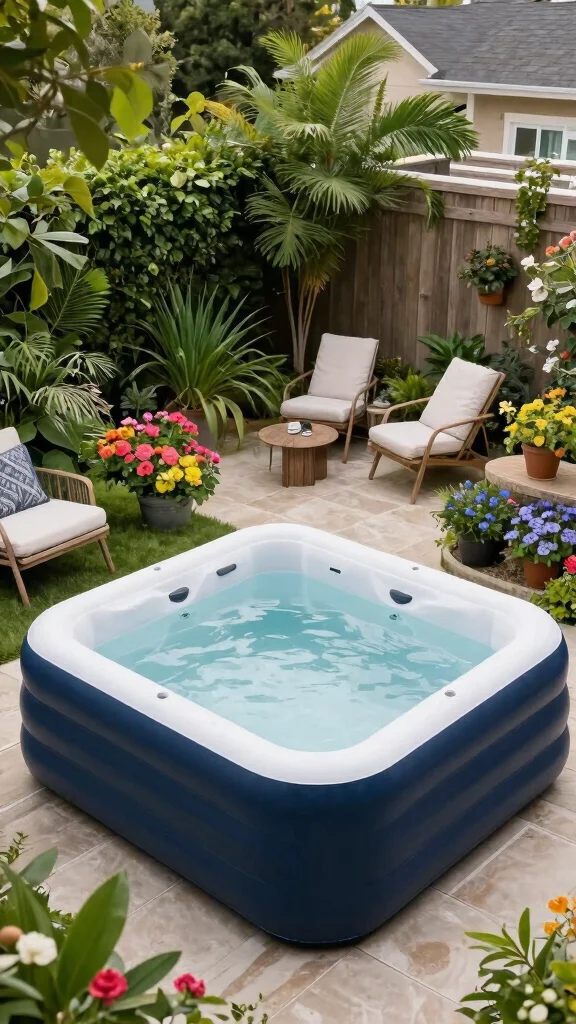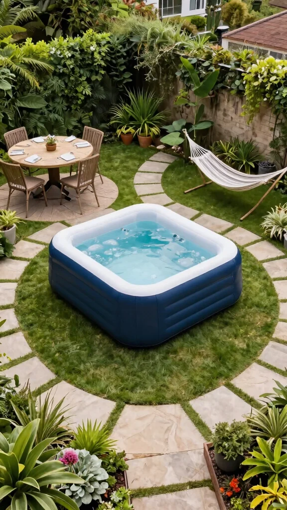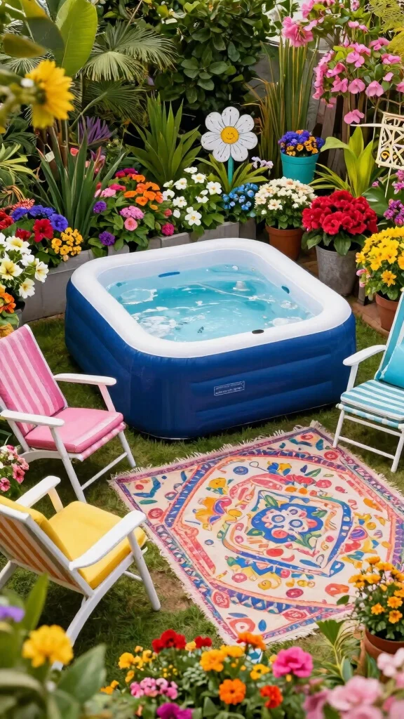 Infuse your garden with a burst of color by placing an inflatable hot tub among your favorite flowers and vibrant plants. Mixing different plant heights and textures creates a lively atmosphere that feels cheerful and inviting. Complement this look with colorful garden chairs and cushions to enhance the playful vibe of your outdoor space.