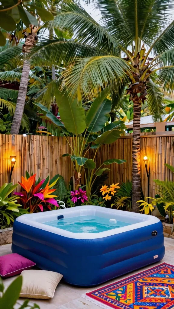 Fun fact: Surrounding your inflatable hot tub with a few potted palms can cut glare and boost privacy by up to 40%. Turn your inflatable hot tub garden ideas into a lush tropical paradise today.
