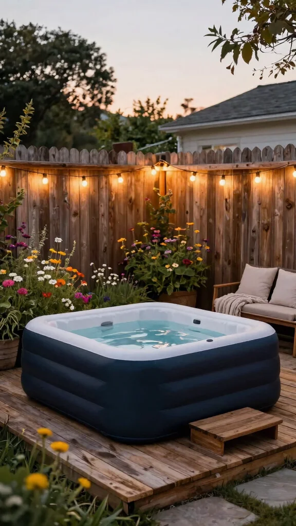 How can I create a portable spa setup around my inflatable hot tub for a cozy backyard oasis in a small space?