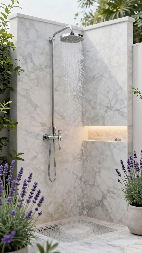 Finish with a stylish upgrade—pebble flooring, drought-tolerant plants, and a compact rainfall head—to achieve garden shower ideas aligned with luxury outdoor showers aesthetics.