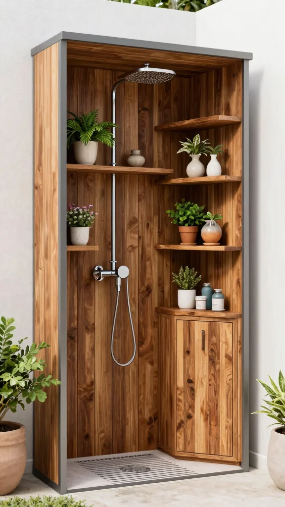 An outdoor shower with built-in storage is an excellent way to keep your towels and toiletries organized while maintaining a sleek design. Choose materials that match your shower’s style, like wood or metal, to create functional storage solutions.