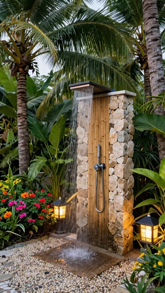 A tropical oasis makes showering feel like a mini-vacation, turning your backyard into a rejuvenating retreat.