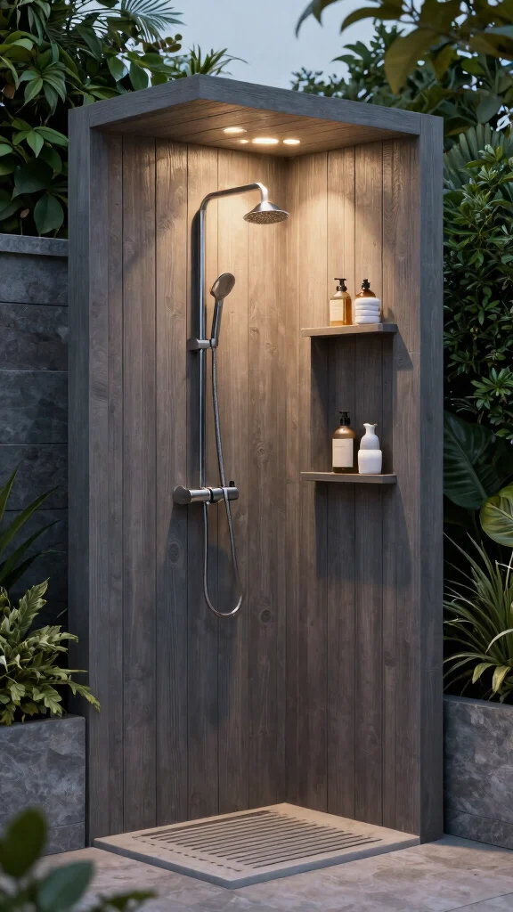 Adding features like built-in seating or storage for towels can further enhance functionality. Don’t forget to include outdoor lighting to create an elegant atmosphere for evening showers. This design combines privacy with aesthetic appeal, allowing you to enjoy your outdoor shower comfortably.