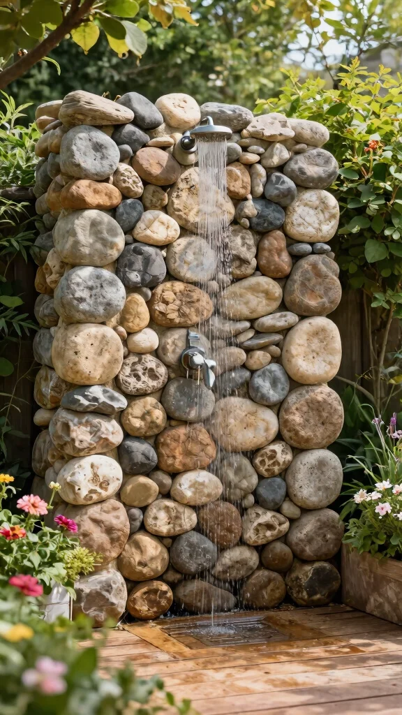 A rustic stone outdoor shower brings a natural beauty that blends seamlessly with your landscape. By using materials like local river stones or slate, you can create a shower that feels both luxurious and earthy. The texture of the stones adds a unique touch to your outdoor space.