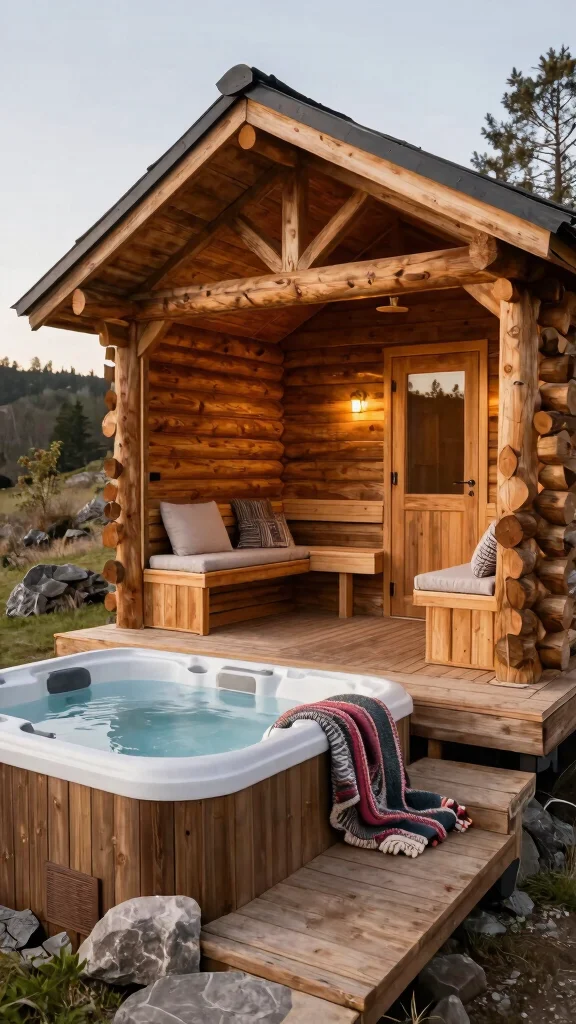 A cozy cabin retreat evokes warmth and peace, perfect for unwinding. Build your sauna to resemble a log cabin, featuring rustic wood accents and an inviting interior. Position a hot tub nearby on a wooden deck, surrounded by comfortable seating and natural stone elements that enhance the cozy atmosphere.