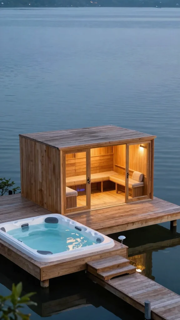 An elegant floating sauna offers a unique experience and stunning views of your surroundings. Picture a sauna on a floating platform, accessible by a small dock, allowing you to enjoy nature while you relax. Pair the sauna with a hot tub on the deck, slightly elevated for breathtaking views.