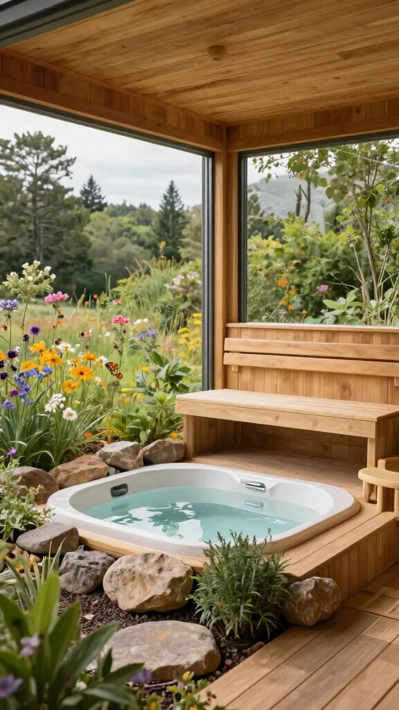 Surround your hot tub with native plants and stones, enhancing the natural feel of your retreat. A wildflower garden nearby can attract butterflies and add colorful accents to your space.