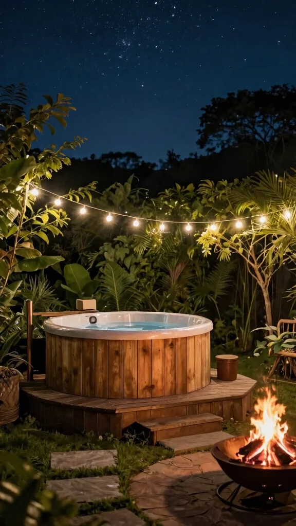 Picture yourself soaking in a rustic hot tub, surrounded by twinkling stars—a perfect getaway from everyday life. A wooden hot tub brings warmth and a natural charm that blends beautifully with your backyard. Imagine a raised wooden platform where you can relax, adorned with string lights that twinkle like stars overhead.