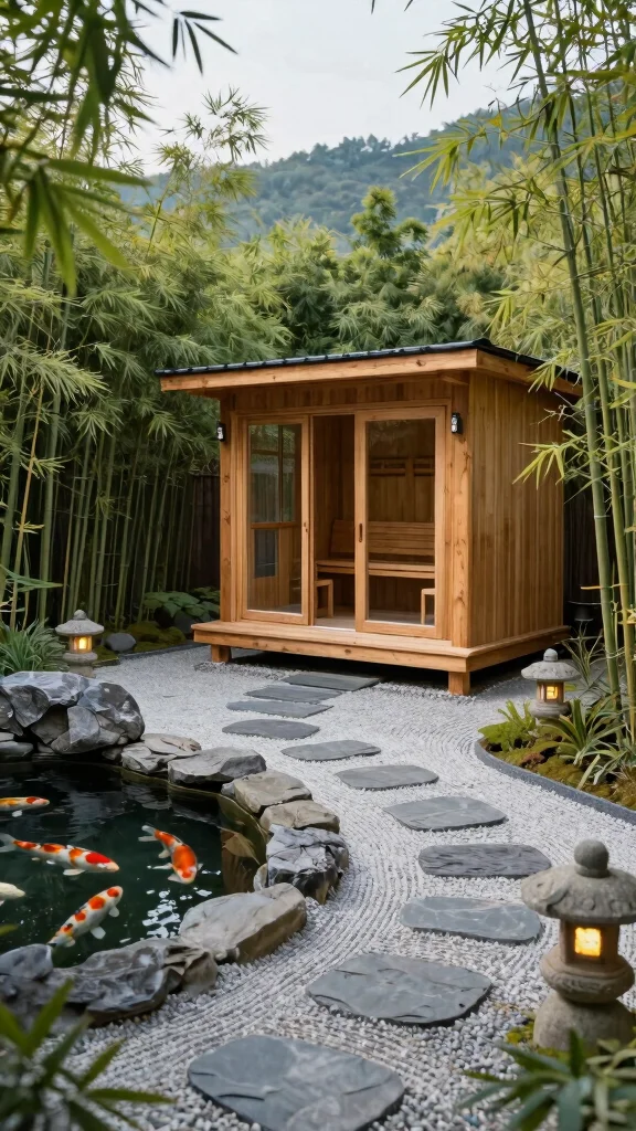 Incorporate features like a koi pond or stone lanterns to enhance the serene atmosphere. Inside, soft lighting and natural wood create a warm, inviting space where you can escape from the world.
