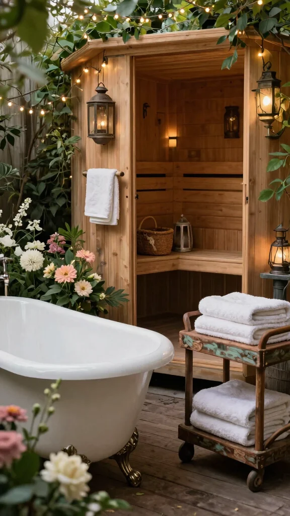A vintage spa vibe isn’t just for show—it’s about cozy, everyday luxury. Bring a clawfoot tub outdoors, add plush towels, and let the scent of flowers turn your outdoor sauna and hot tub into a retreat you reach for daily.