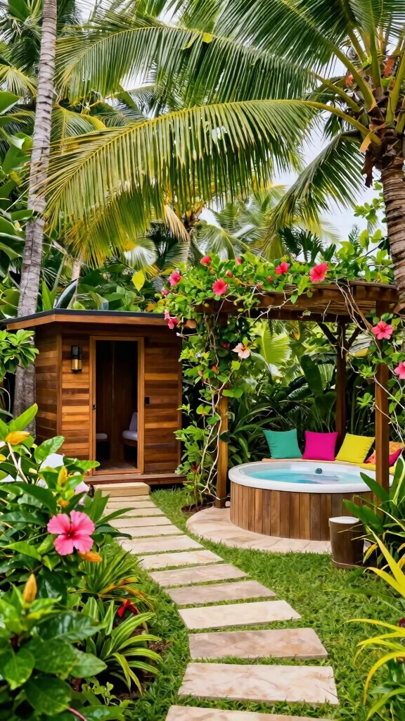 Turn your backyard into a vibrant tropical paradise with lush foliage and an outdoor sauna or hot tub that harmonizes with nature. Picture tropical plants like palm trees and hibiscus surrounding your retreat, creating a colorful, lively environment. Build your sauna using natural bamboo or wood and place your hot tub under a pergola draped with climbing vines.
