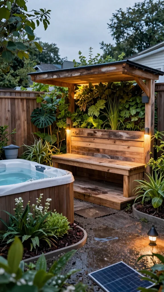 Surrounding your area with native plants and a rain garden conserves water and attracts local wildlife. A living wall or vertical garden can further enhance the green vibe of your retreat.
