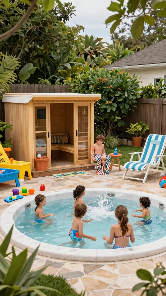 Design a family-friendly wellness retreat that everyone can enjoy. An outdoor sauna and hot tub offer relaxation for adults while incorporating playful features for children. Imagine a splash pad or small pool nearby, ensuring kids have their fun while adults unwind.