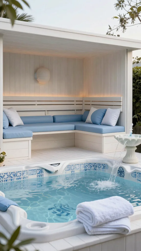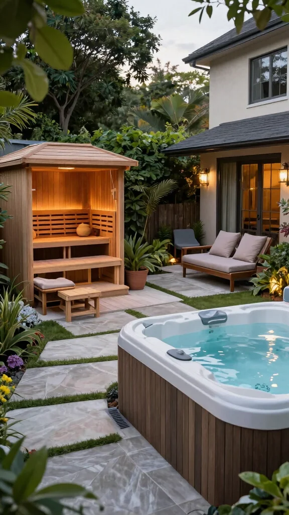 For a chic spa-like vibe, focus on elegance and indulgence. An outdoor sauna with sleek lines and plush seating invites you to unwind in style. Pair it with a hot tub adorned with exquisite tiles and a nearby fountain, enhancing the serene spa atmosphere.