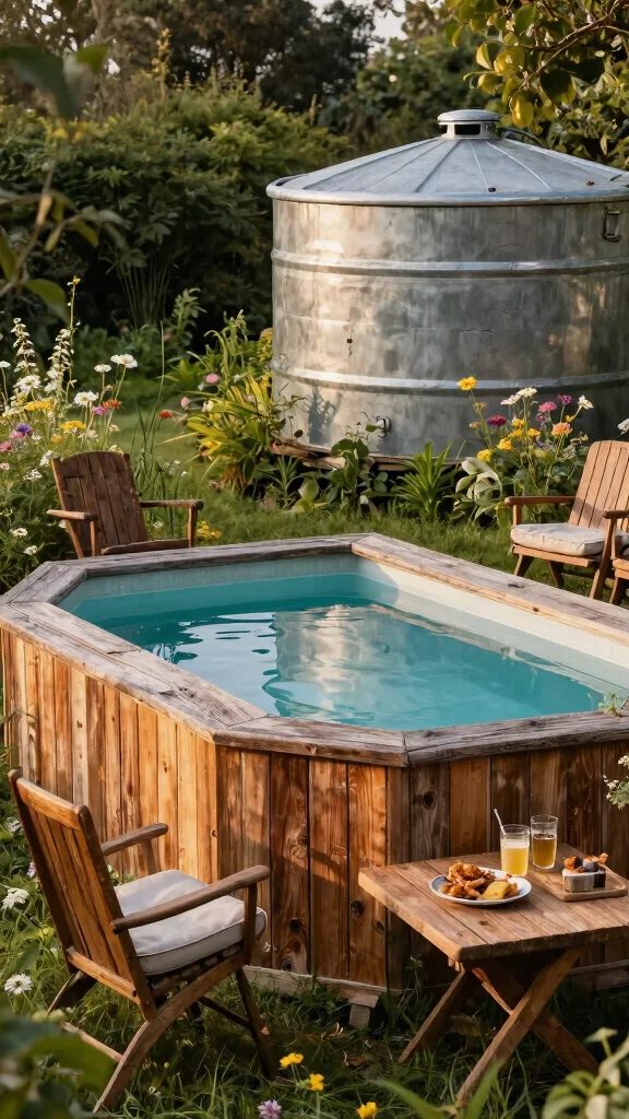 Start by selecting reclaimed wood that complements your tank’s aesthetic. Incorporate vintage furniture to enhance the rustic vibe, and consider surrounding your pool with native plants to conserve water and attract wildlife.
