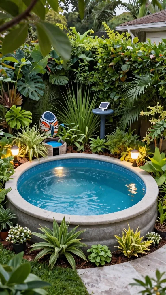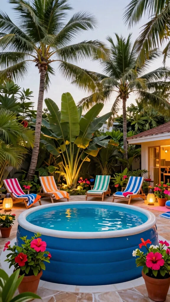 Enhance the tropical atmosphere with bright beach towels and sun umbrellas. Consider adding string lights or lanterns for a magical glow during evening swims, and a small fountain to create soothing sounds.