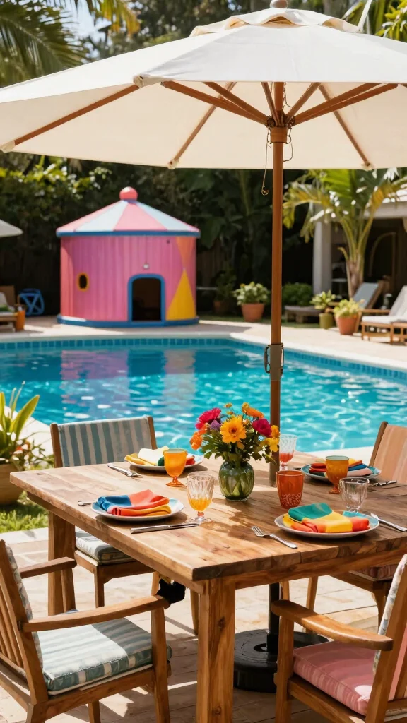 Invest in a sturdy dining table with comfortable chairs designed for outdoor conditions. Consider adding an umbrella or pergola for shade during sunny days, and decorate your space with colorful tableware that complements the pool.