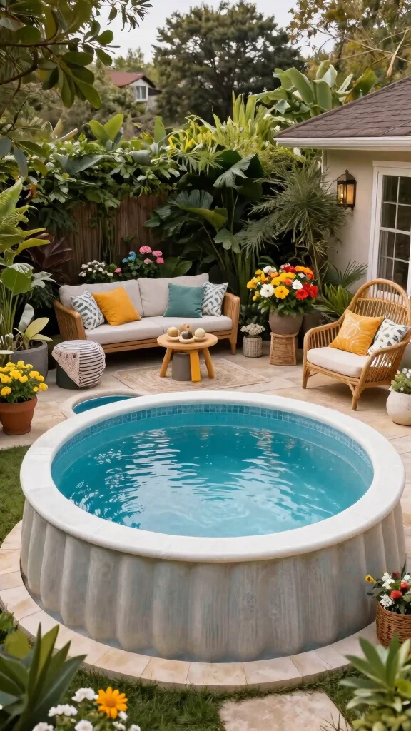 Capture the charm of yesteryears by pairing your poly stock tank pool with delightful retro decor. Think pastel colors, vintage pool floats, and classic striped umbrellas for a nostalgic touch. This playful aesthetic adds a fun element to your garden while maintaining an elegant flair.