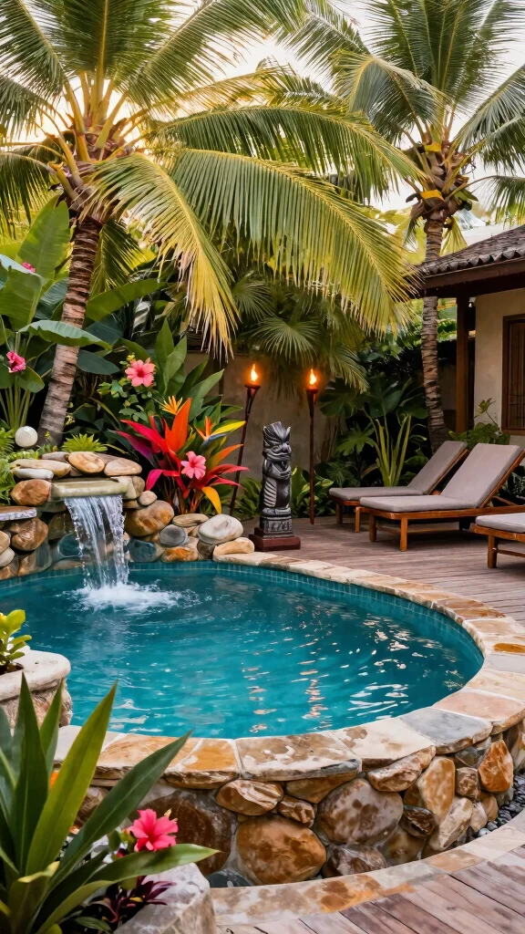 Start by selecting a natural stone or pebble finish for your pool that harmonizes with your surroundings. Consider adding a waterfall feature to create soothing sounds and a beautiful focal point. Enhance the tropical theme with tiki torches and bamboo accents for an island feel.