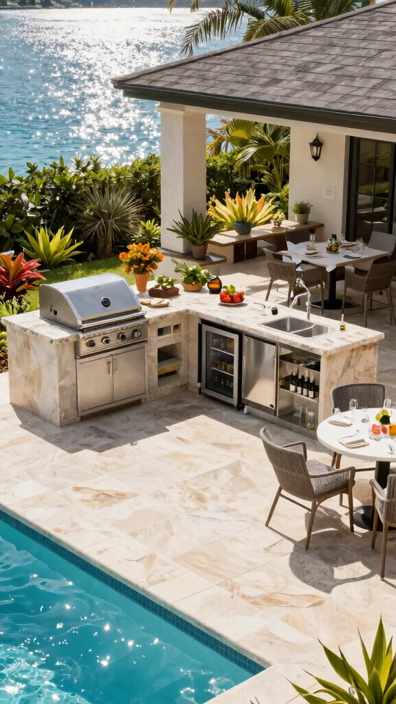 Enhance your outdoor living experience by adding a fully equipped outdoor kitchen or bar next to your pool. This not only boosts functionality but also makes hosting gatherings easy and enjoyable. Picture grilling while friends relax by the pool, enjoying snacks and drinks just a reach away.