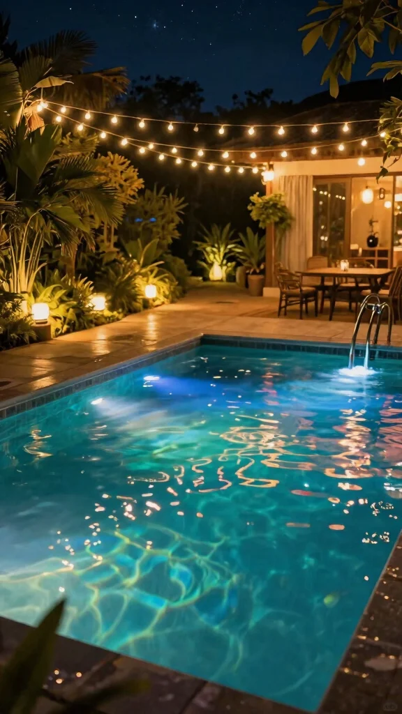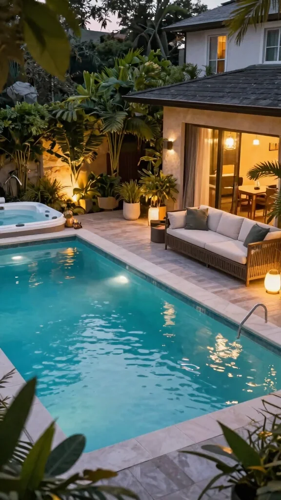 Consider installing LED lights in the pool and hot tub for a stunning visual effect. Use soft, warm lights along pathways and around landscaping for a welcoming feel. Incorporate mood lighting in seating areas with lanterns or string lights for extra charm.