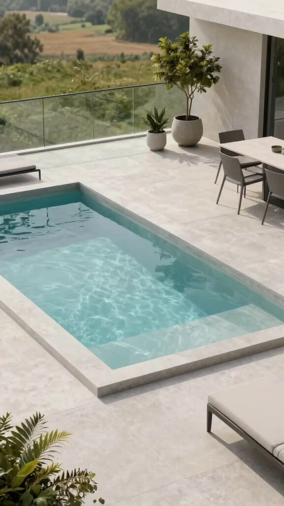 Consider using polished concrete or stone tiles for a refined look. Limit decorations to a few sculptural plants in clean pots to maintain a clutter-free environment. Choose chic, modern furniture that complements your pool design for a cohesive feel.