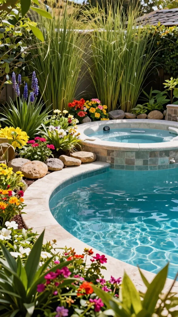 Which plants and garden features work best around a pool and hot tub backyard to boost year-round appeal?