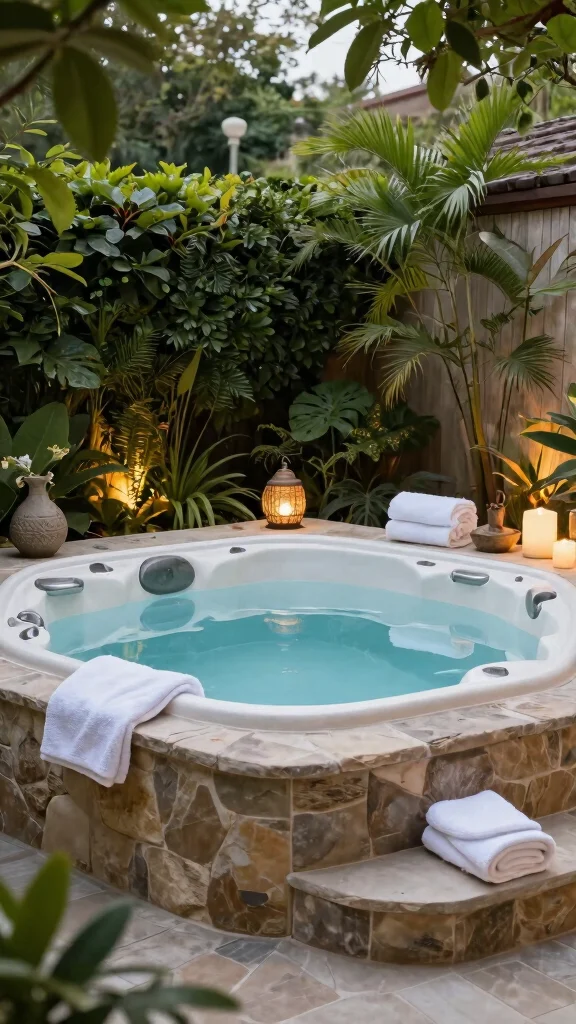 Enhance your hot tub experience by using natural stone or tile around the tub for a beautiful finish. Add plush towels, soft lighting, and even aromatherapy diffusers for a spa-like feel. Create a small seating area nearby for relaxation before or after your soak.