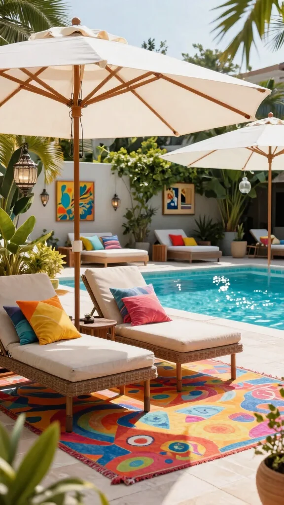 Incorporate vibrant outdoor rugs to define different spaces around the pool. Use oversized umbrellas or shade sails for sun protection while adding flair. Hang art pieces or decorative lanterns to create visual interest and charm.
