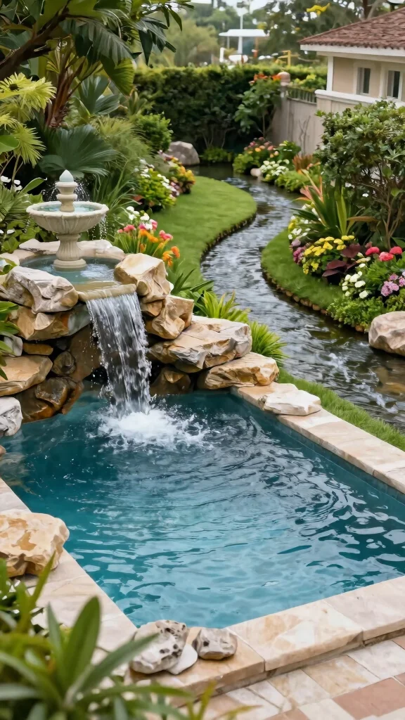 Consider using natural stones to craft a waterfall that integrates beautifully with your landscaping. A stylish fountain at the edge of the pool adds a sophisticated touch while a tranquil stream can connect your pool and hot tub areas.